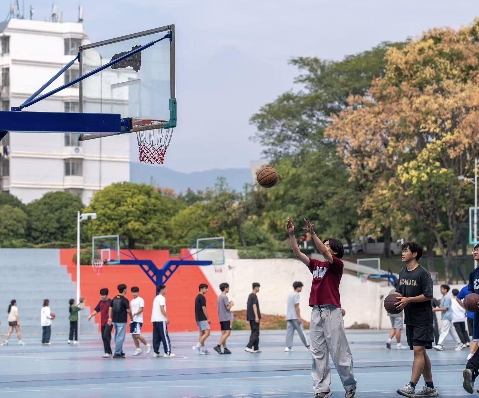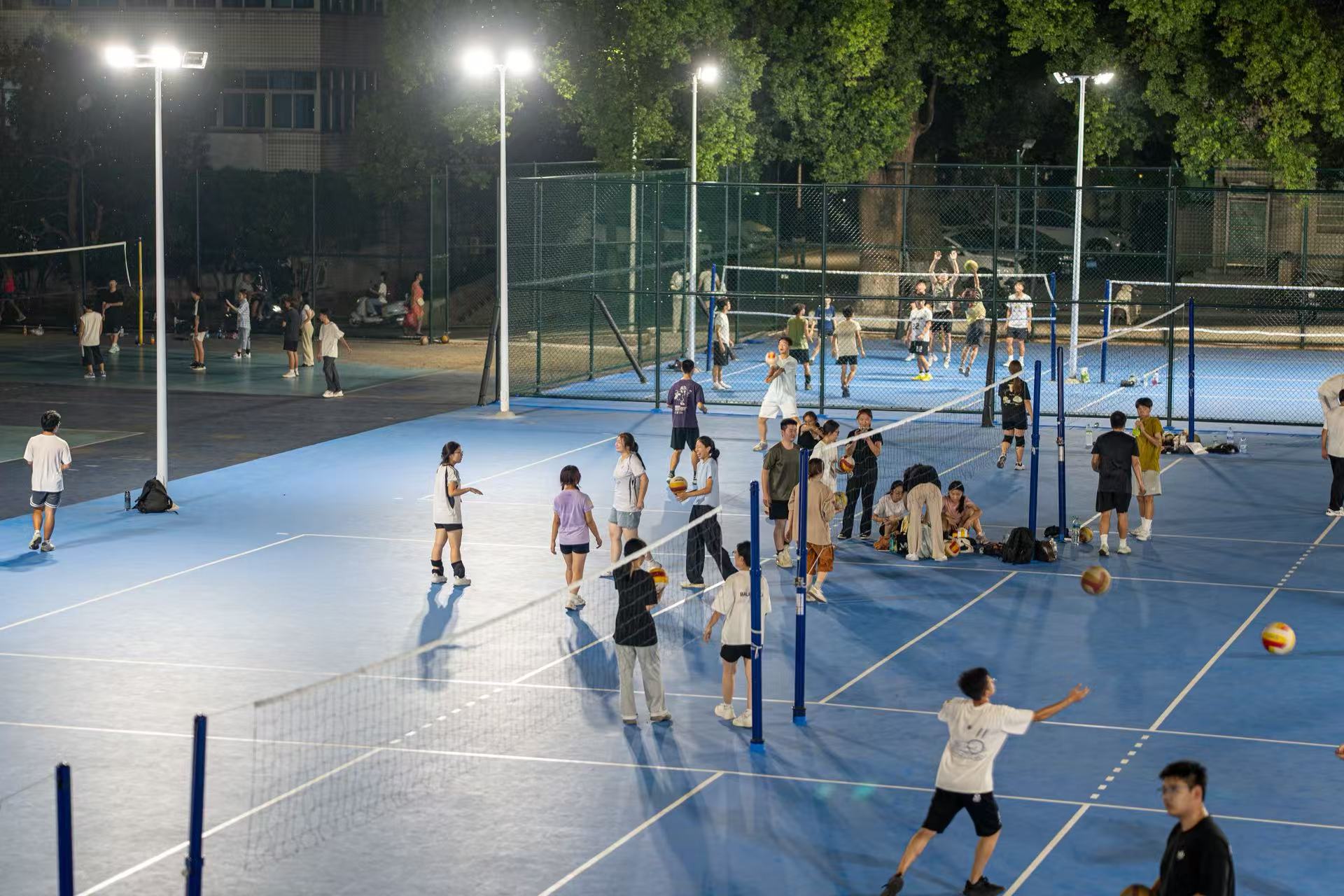 体育是重要的育人方式,运动环境是重要的育人场所。改造后的南北区篮排球场,保持了绿树掩映的画面美感,球场周边增加了健身区、增加了灯光、悬挂了体育运动标语。通过套线方式,增设了匹克球场,实现“一场多用”的智慧运行模式,满足师生体育运动多元化需求。