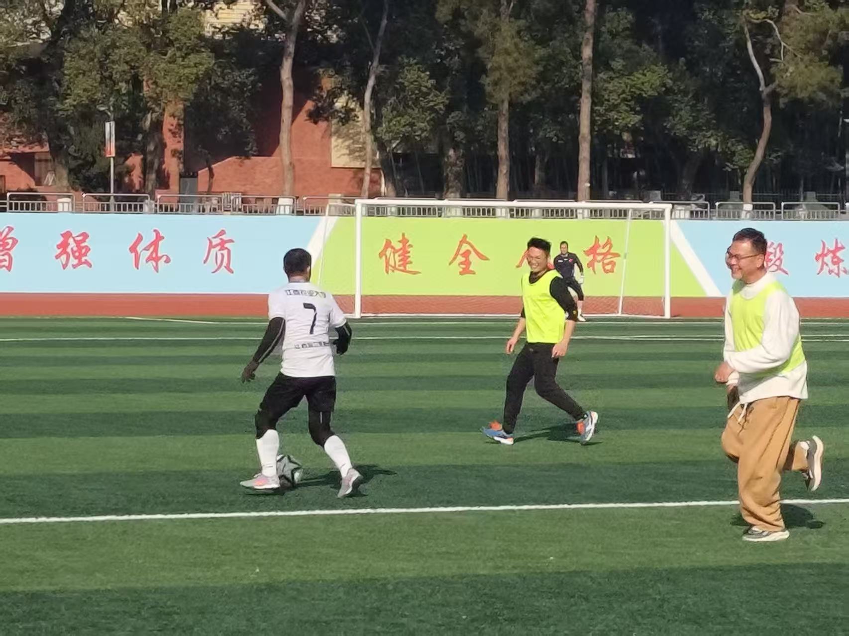 赛场上,大家相互配合、默契传球,攻防转换尽显竞技风采。奔跑、抢断、射门,每个动作都凝聚着团队力量,展现出教职工奋勇争先的精神。场边的教师、学生不时为队员加油鼓劲,为漂亮进球欢呼雀跃。经过一小时激烈角逐,双方最终以3:3的比分在欢乐和谐的氛围中结束比赛。